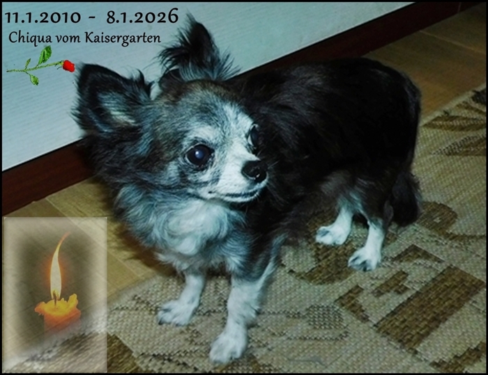 Heute morgen mußten wir eine Entscheidung treffen und unsere kleine Chiqua nach 2 schweren Anfällen im Alter von 16 Jahren gehen lassen. Traurigkeit und viele Tränen und es ist bei uns ganz still. Meine kleine tapfere geliebte Diva, auch wenn wir darauf vorbereitet waren ist es schwer. Trotz der Prognose unseres damaligen Tierarztes das du es mit deinem Nervenleiden nur max. 5 Jahre schaffst hast du an deinem schönen behüteten ruhigen Leben festgehalten und es gab ein auf und ab. Meine Süße, lange wird es dauern bis ich es akzeptiert habe. Der einzige Trost....du hattest ein sehr sehr schönes Zuhause bei uns. |
